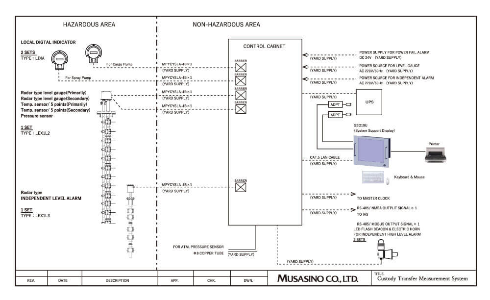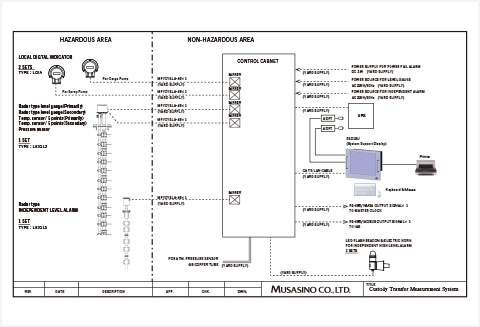 Various equipment such as level gauges, pressure gauges, and temperature gauges, are necessary for liquid gas measurements. Musasino’s proprietary digital signal processing is applied to unify the signals. One cable is used to send signals to the control box, so the number of cables required for outfitting is reduced.